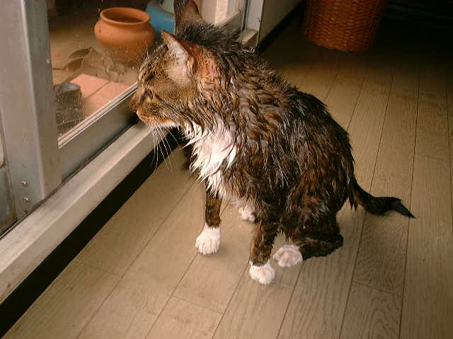 体重が往事の半分くらいで、濡れると小さくなって憐れな様子です。